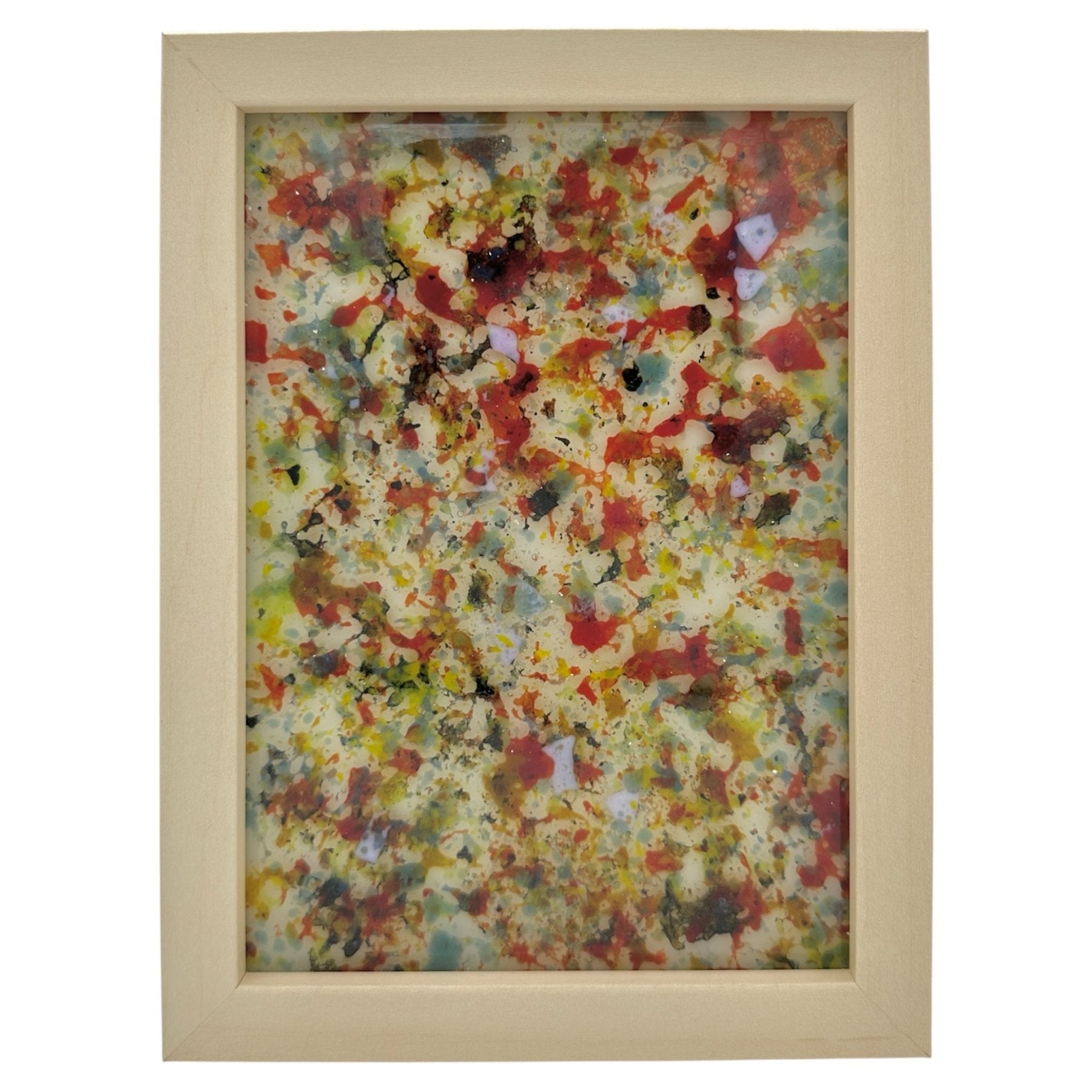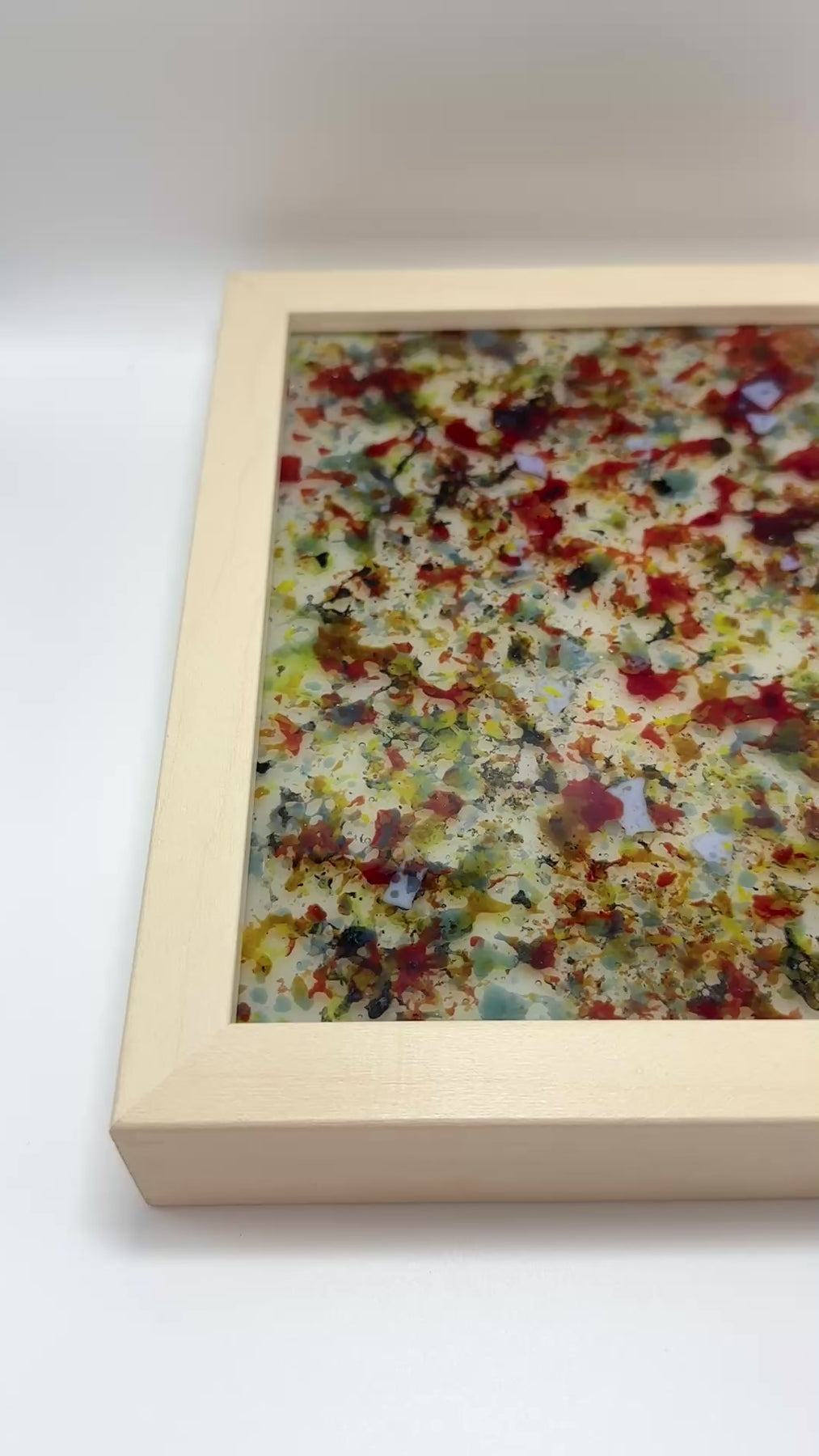 Each one-of-a-kind piece begins with finely sifted glass powder, fired into wafer-thin sheets, then intentionally broken into organic fragments. These glass wafers are layered onto a fully fused glass base and fired again, bonding the elements into a single, unified structure. Surfaces shift from textured and stratified to more compressed, resolved states.