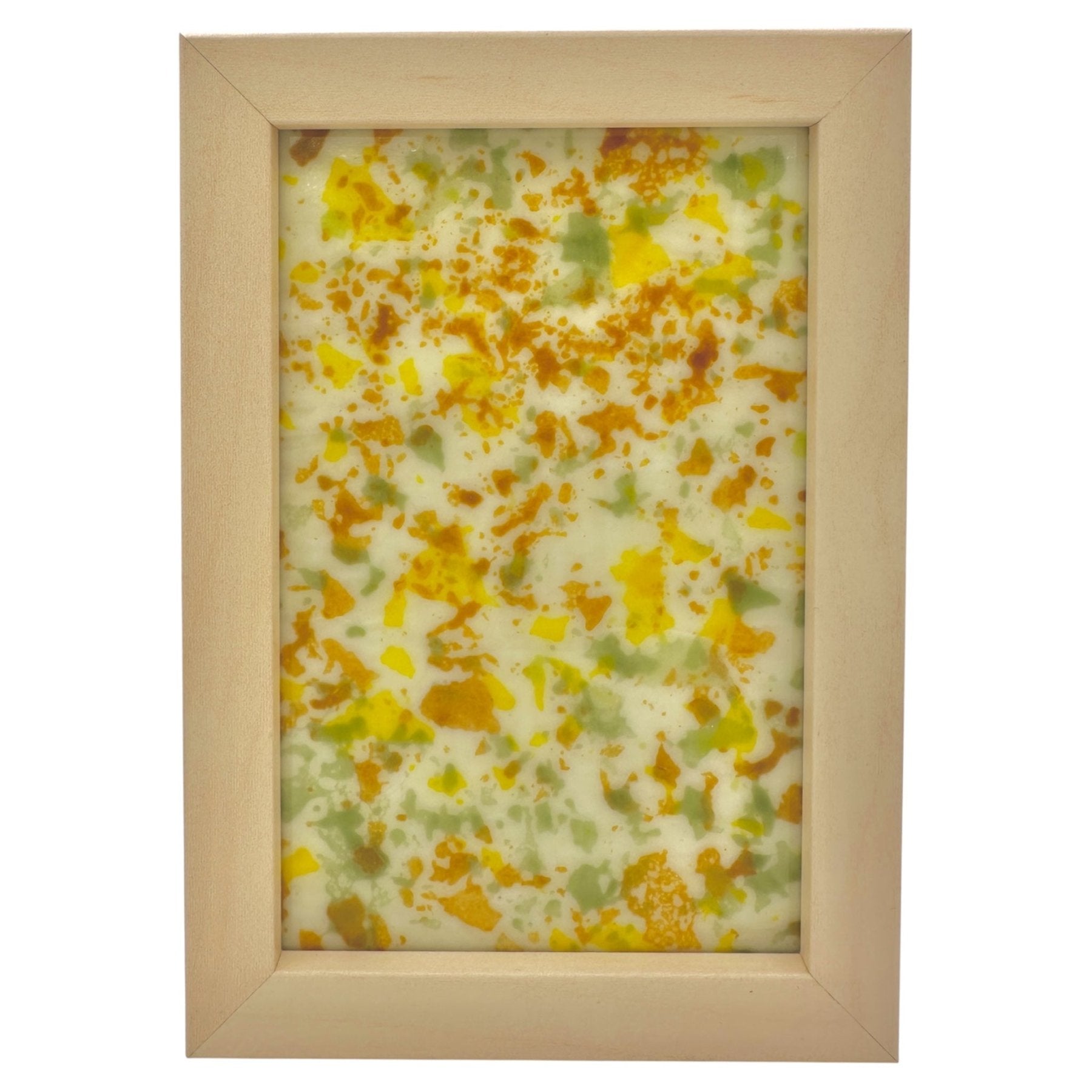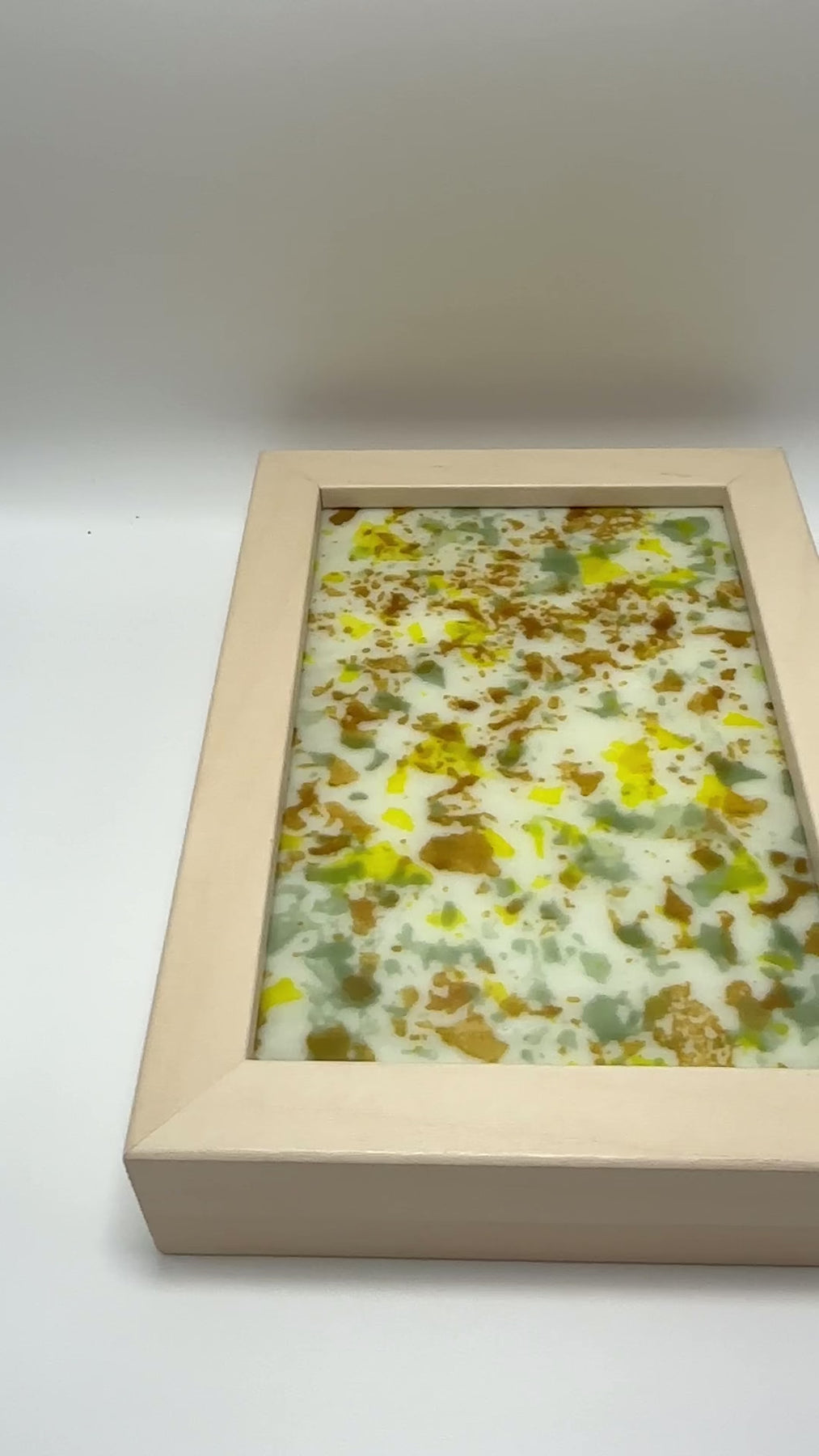 Each one-of-a-kind piece begins with finely sifted glass powder, fired into wafer-thin sheets, then intentionally broken into organic fragments. These glass wafers are layered onto a fully fused glass base and fired again, bonding the elements into a single, unified structure. Surfaces shift from textured and stratified to more compressed, resolved states.