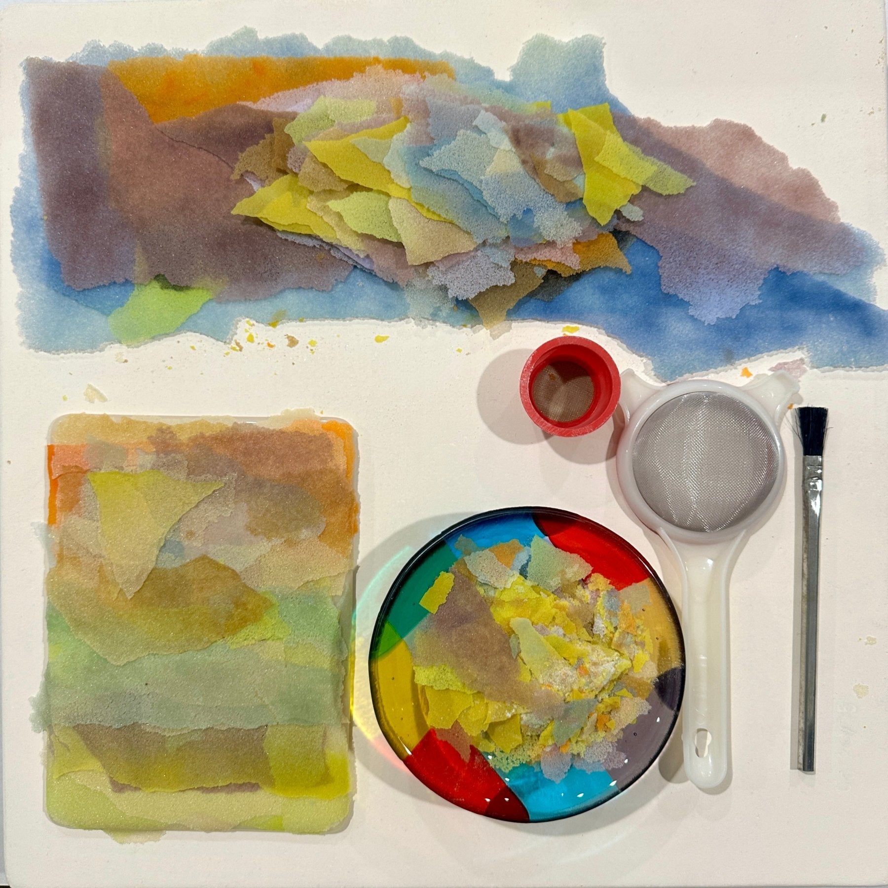 Each one-of-a-kind piece begins with finely sifted glass powder, fired into wafer-thin sheets, then intentionally broken into organic fragments. These glass wafers are layered onto a fully fused glass base and fired again, bonding the elements into a single, unified structure. Surfaces shift from textured and stratified to more compressed, resolved states.